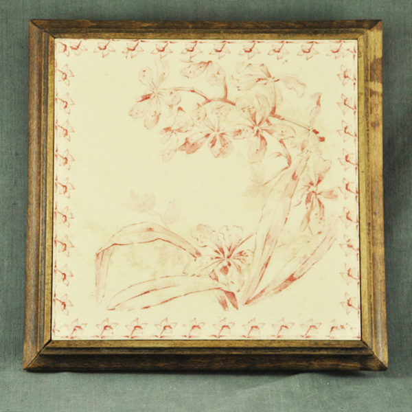 Dessous de plat fin XIXème en faïence ivoire dans un support en bois, décor floral rose pale, en bon état.
