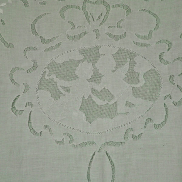 Dessus d’édredon 1900 en fin linon blanc vollanté et bordé de dentelles aux aiguilles, 2 chérubins au centre , en très bon état.