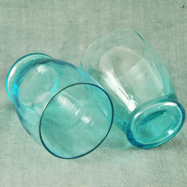2 jolis verres à eau ca 1920 bleu turquoise légèrement cannelés, en bon état.