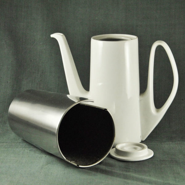 Cafetière isotherme de WMF ca 1960en porcelaine blanche de Bauscher Weiden Bavaria dans sa coque en métal anodisé en excellent état.