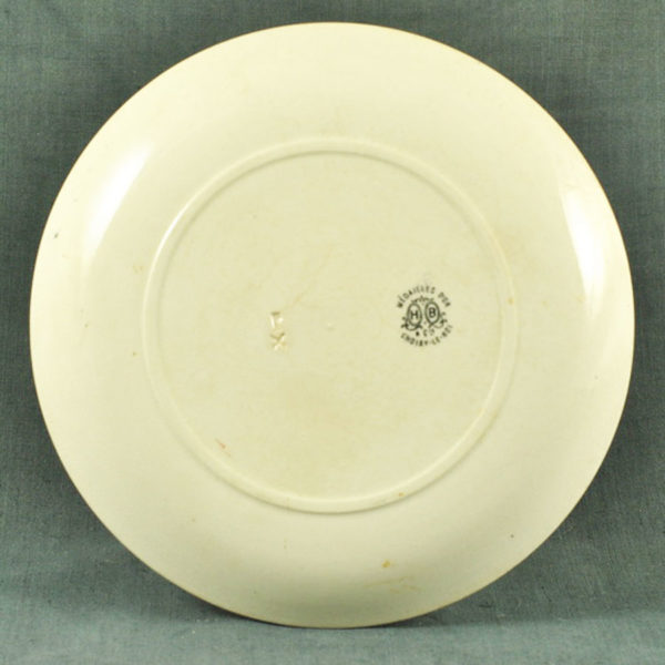 Assiette « parlante » ca 1880 en faïence ivoire de Choisy le Roi (H B & Cie), série « le langage des fleurs N° 11 » la rose capucine qui s’y frotte s’y pique » en très bon état.