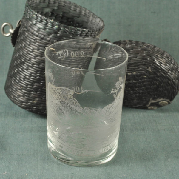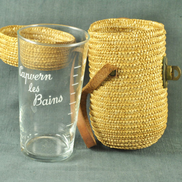 Verre de cure gradué « Capvern les bains dans son panier en paille, en très bon état.