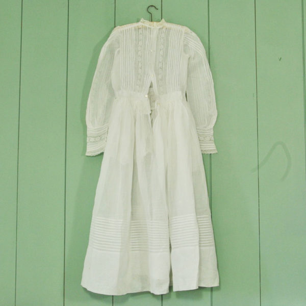 Très jolie robe de communiante 1900 en oragandi blanc doublé, entièrement fait main, petits plis sur le buste, les manches et le bas de la robe et entredeux en dentelle de Calais, en bon état.