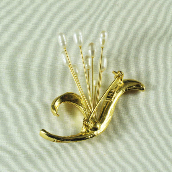 Jolie broche ca 1980 en métal doré et perles fantaisie, marque MLJ, en très bon état.