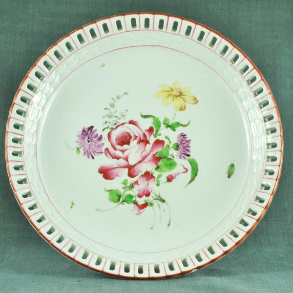 Elégant compotier XIXe en faïence blanche, ajouré sur le bord , frise en relief, décor floral pastel au centre peint et filets roses, en excellent état.