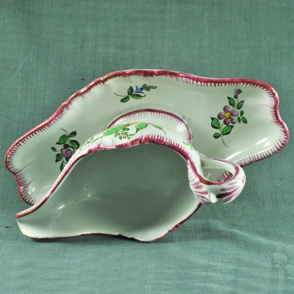 Jolie Saucière 1900 en faïence épaisse de St Clément, décor floral peint à la main, filets rose foncé en très bon état.