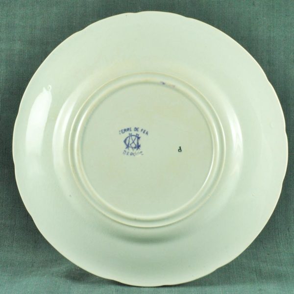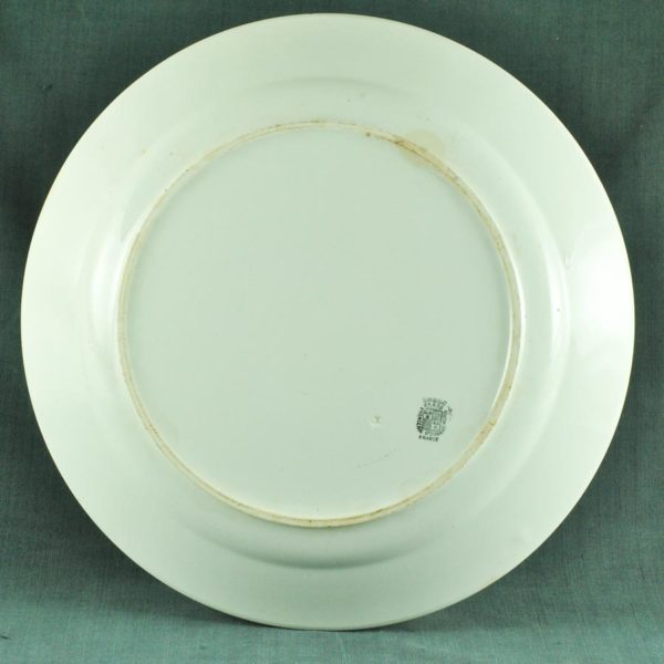 Assiette XIXe en faïence blanche de Creil et Montereau, vignette « le trait d’union » en noir, frise décorative mauve en excellent état.