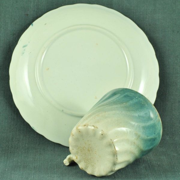 Petite tasse à café et sa soucoupe en faïence ivoire torsadée, décor vert, en bon état.