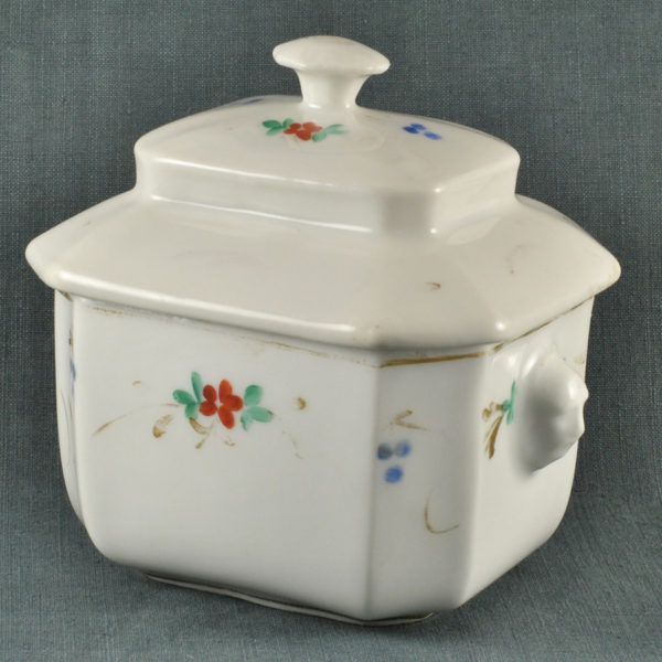 10,00 €Sucrier octogonal fin XIXe en porcelaine blanche, fleurettes rouges et grappes bleu lavande soulignées de branches vieil or, en très bon état. H.: 120 mm 107 x 91 mmSucrier octogonal fin XIXe en porcelaine blanche, fleurettes rouges et grappes bleu lavande soulignées de branches vieil or, en très bon état. […]