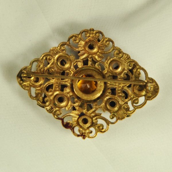 Jolie broche ca 1920 en laiton; décor feuillage et strass gold sur un fond en filigrane 30×40 mm