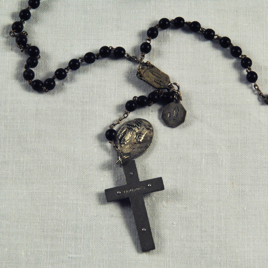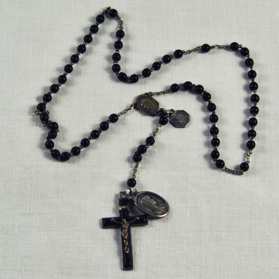 Grand chapelet 1930, perles en nacre grise, médaillon en métal argenté, « Avé Maria Lourdes » avec son petit étui en cuir. L.: 47 mmGrand chapelet 1930, perles en nacre grise, médaillon en métal argenté, « Avé Maria Lourdes » avec son petit étui en cuir. L.: 47 mmGrand chapelet 1930, perles en nacre […]