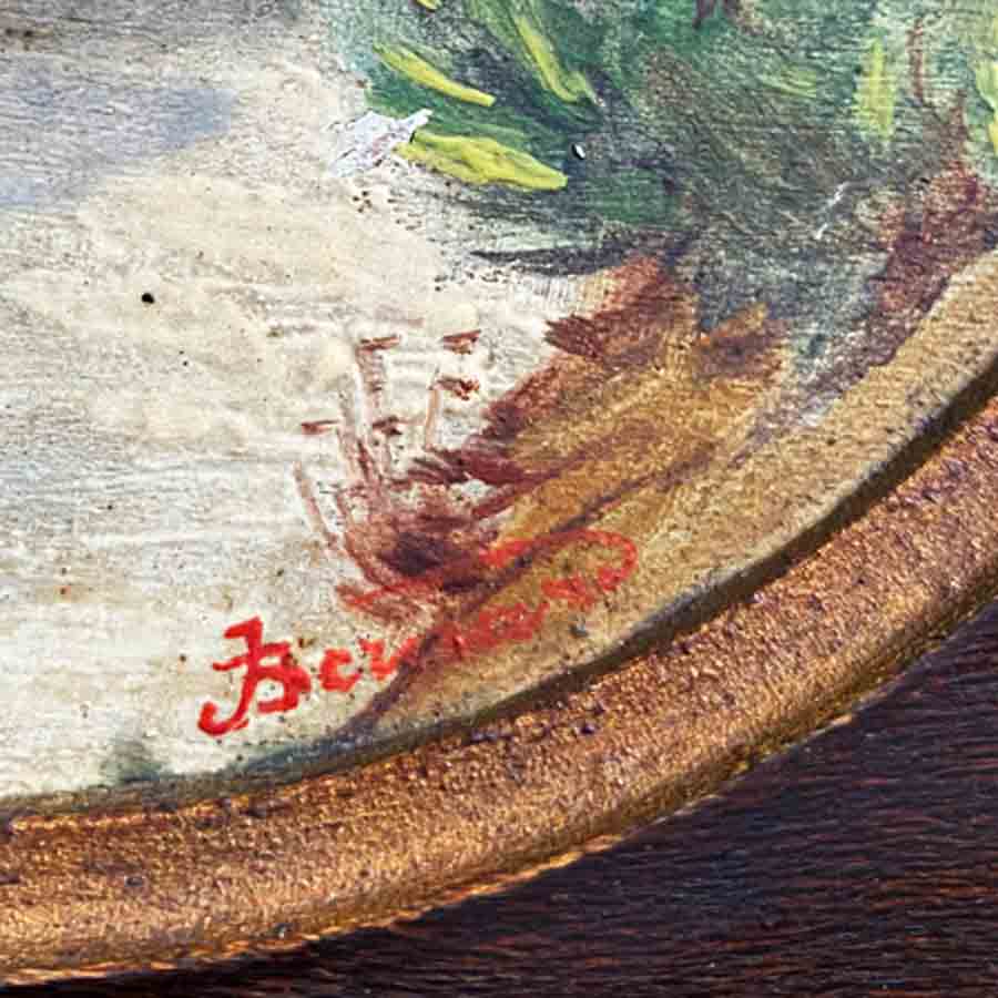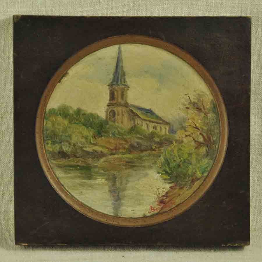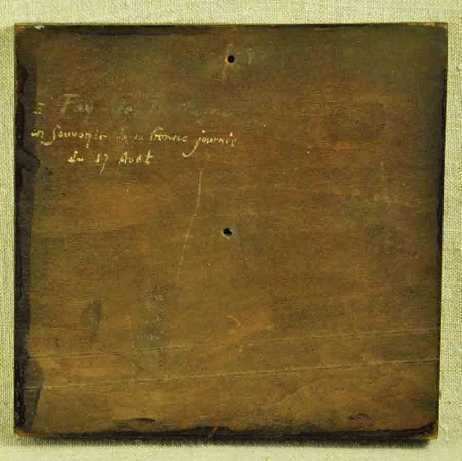 « Souvenir d’une bonne journée » huile sur bois en médaillon dans un cadre carré, signée, en bon état.