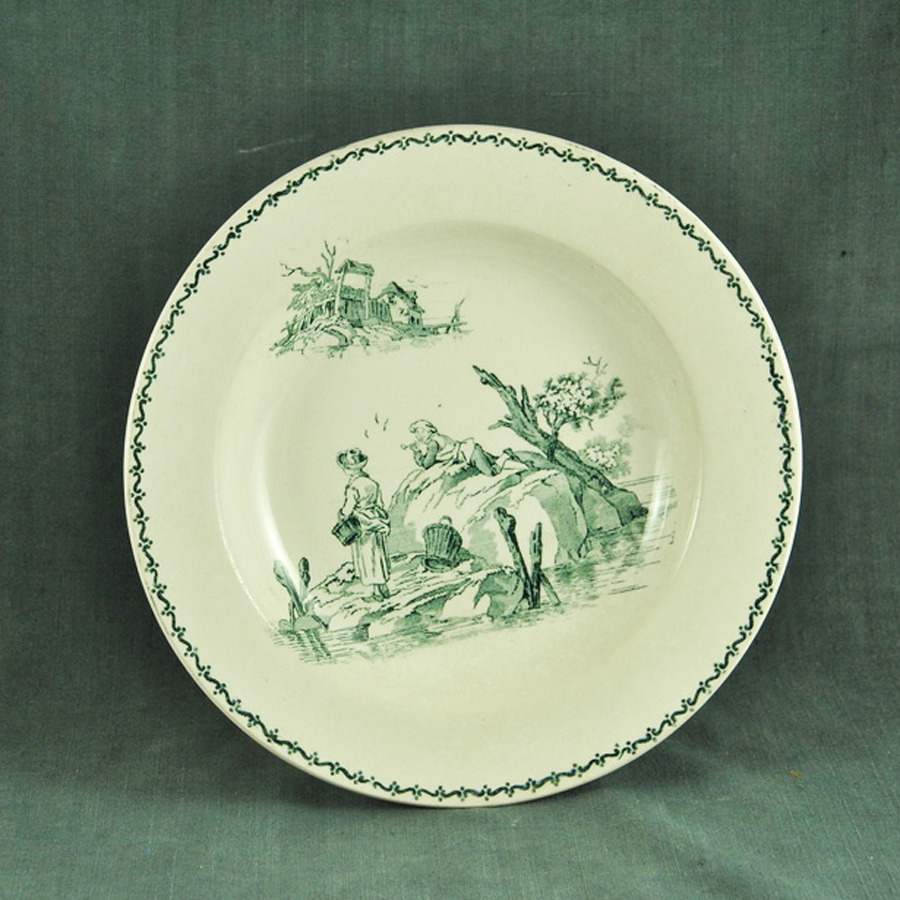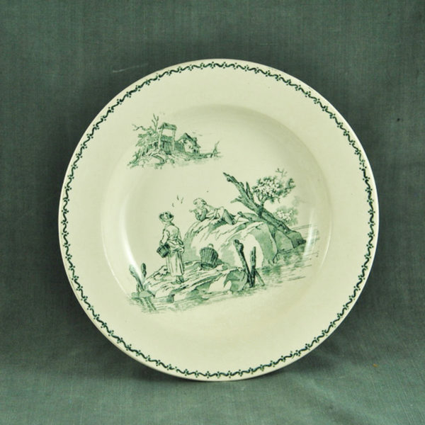 Très charmante assiette creuse XIXème en faïence ivoire de Creil & Montereau, service « Polfere », scène champêtre vert de gris, en bon état.