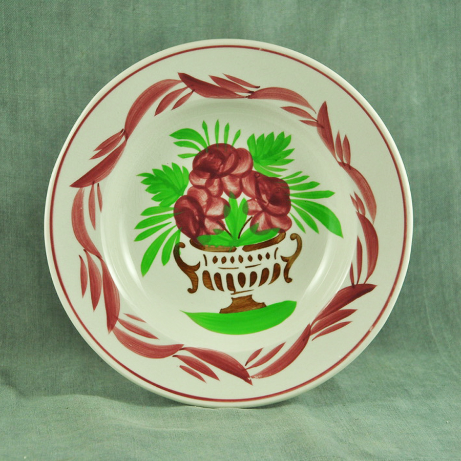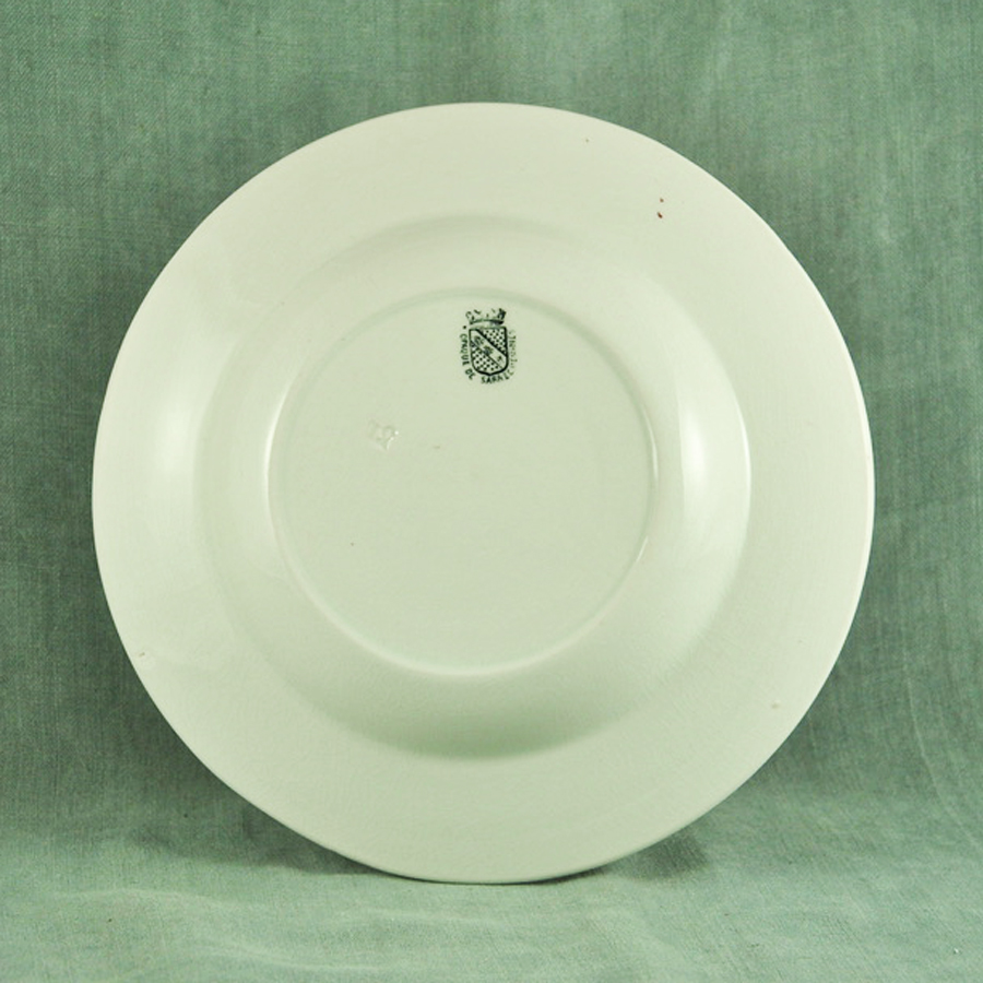 Belle assiette creuse XIXème en faïence blanche de Sarreguemines, décor floral et frise peints à la main, en bon état.