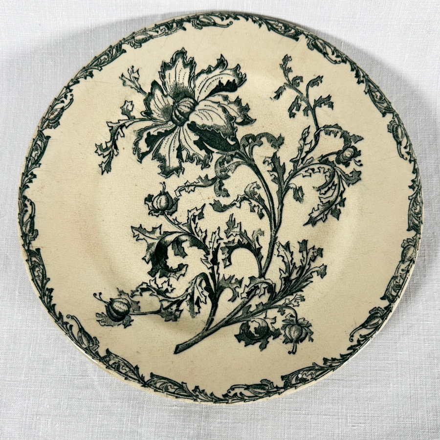 Très belle assiette XIXème en faïence fine ivoire de Jules Vieillard Bordeaux, décor floral noir, en bon état.