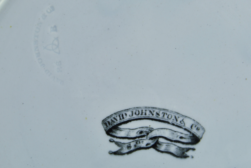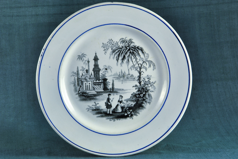 Assiette à dessert en faïence fine décor romantique noir sur fond blanc filets bleus Bordeaux 1840 David Johnston