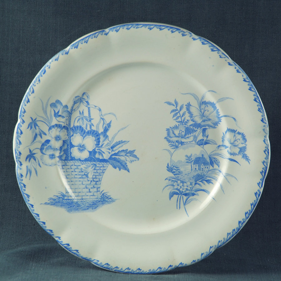 Jolie assiette plate en faïence blanche XIXe, décor: panier de pensées et œillets bleu pale.