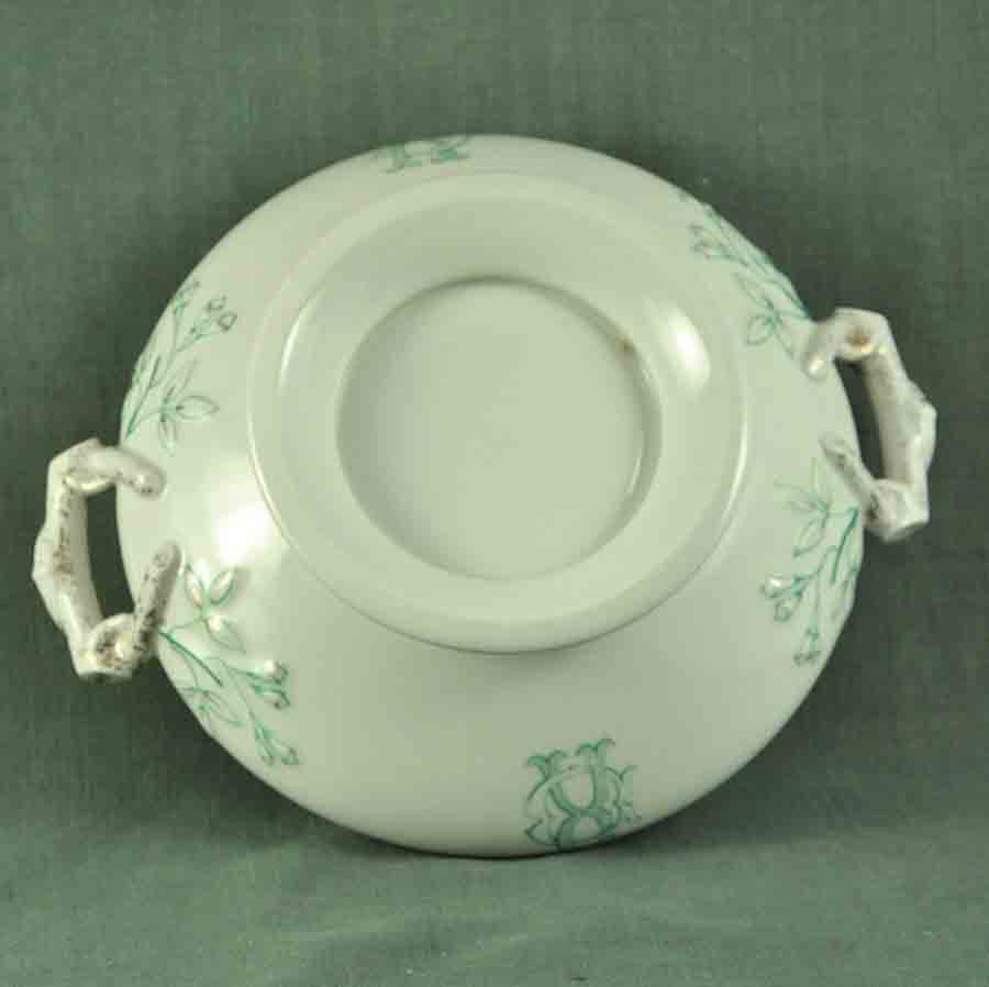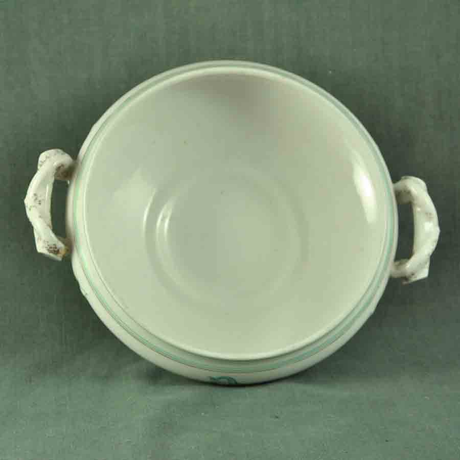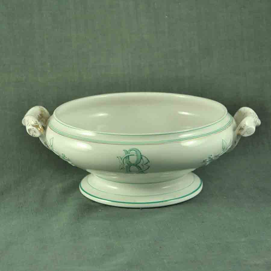 Joli légumier XIXème en porcelaine blanche, filet et monogramme vert soulignés de vieil or, en bon état.