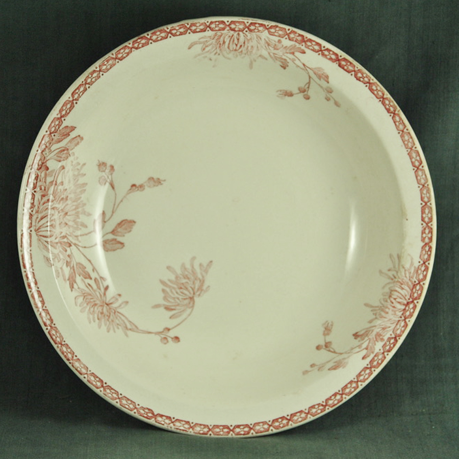 Joli et très grand lat creux XIXème en faïence blanche de Creil et Montereau, décor floral »Turenne » rose, en bon état.