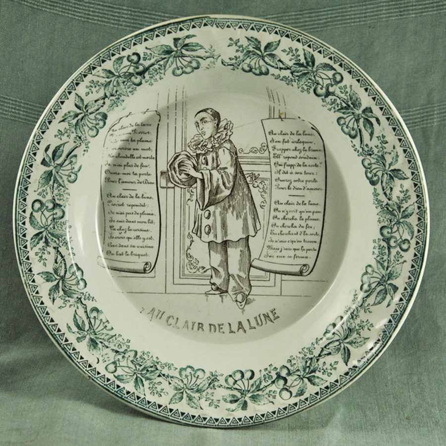 Etonnant plat creux XIXème en faïence blanche de Choisy le Roi, frise verte entourent la chanson « Au clair de la lune », -petite fêlure sur le bord-
