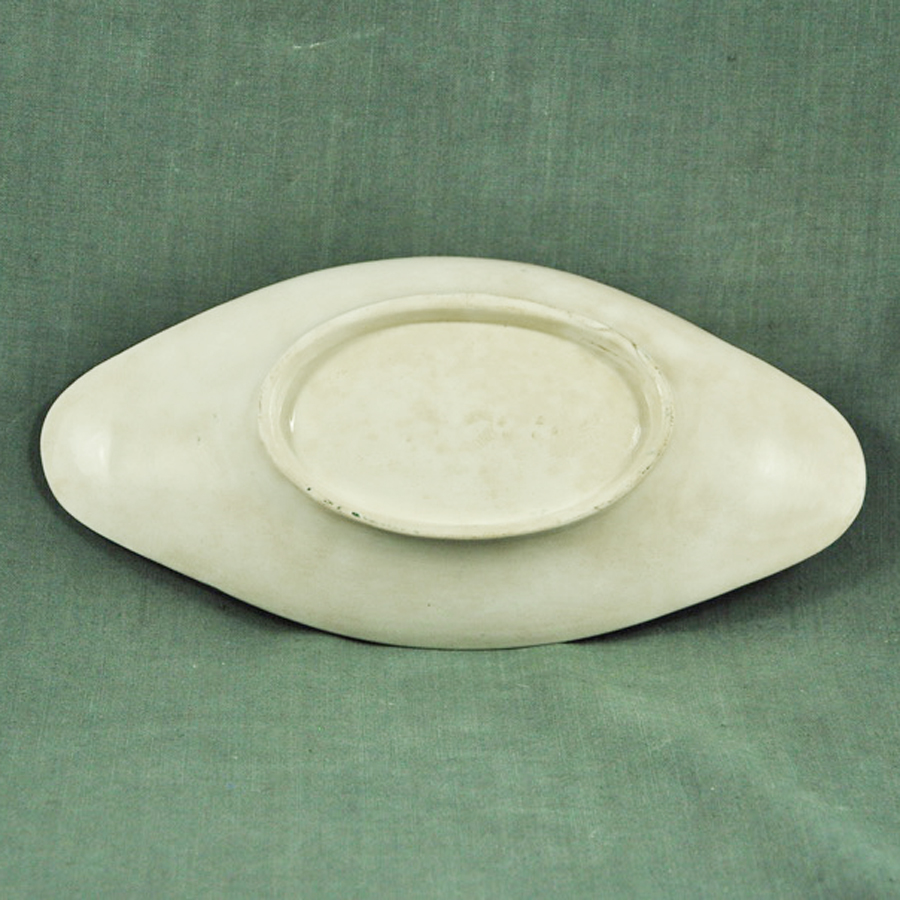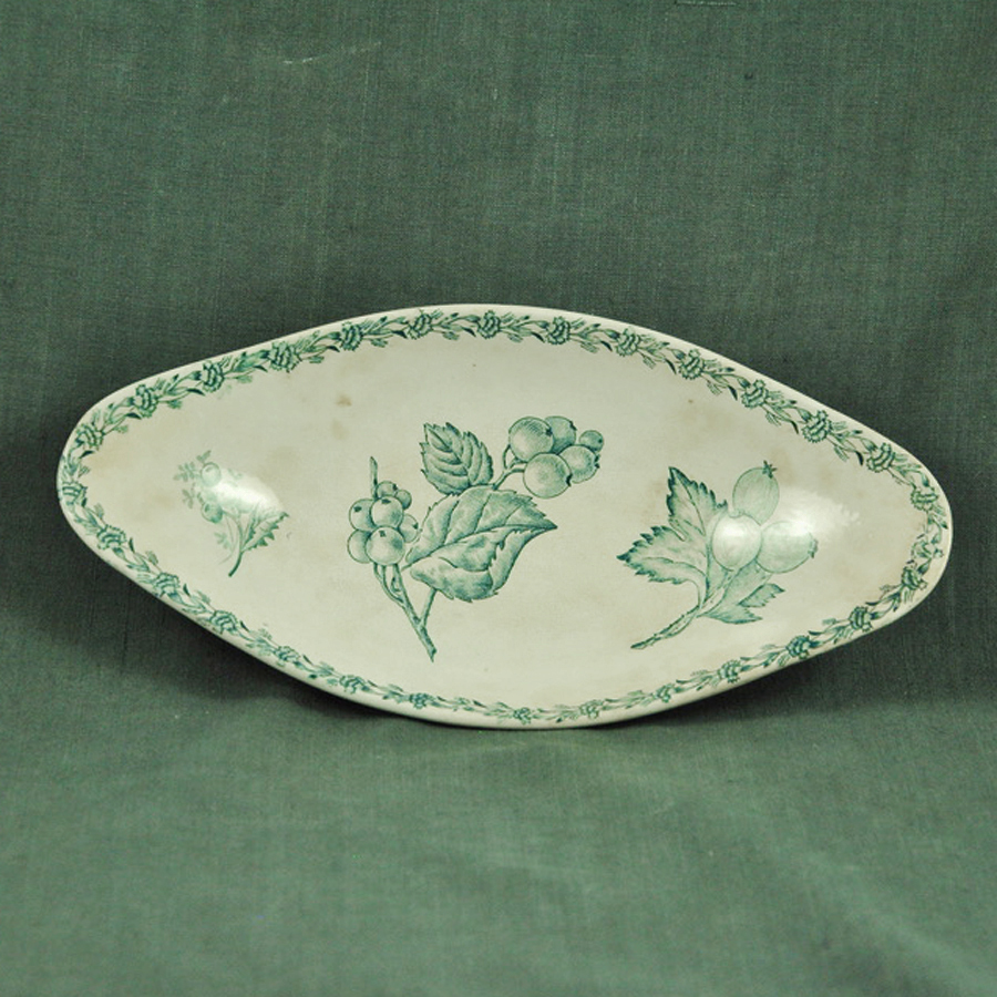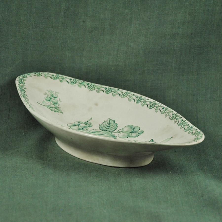 Ravier XIXème en faïence blanche de Longwy un peu tachée, décor groseilles vert de gris, en bon état.