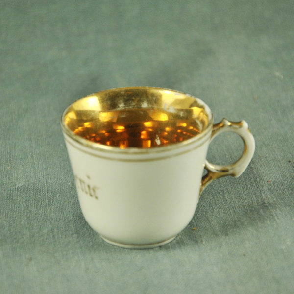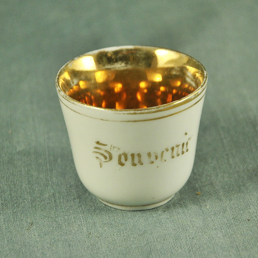 Petite tasse souvenir XIXème en porcelaine fine blanche, souvenir en vieil or et dorée à l’intérieur, en bon état.