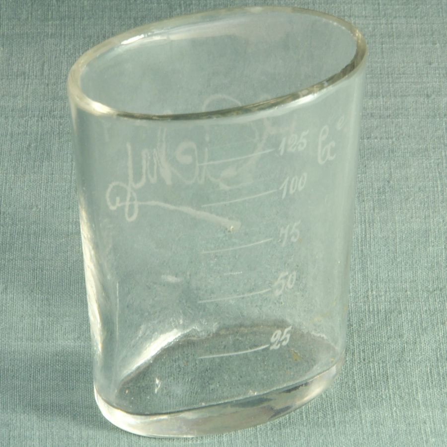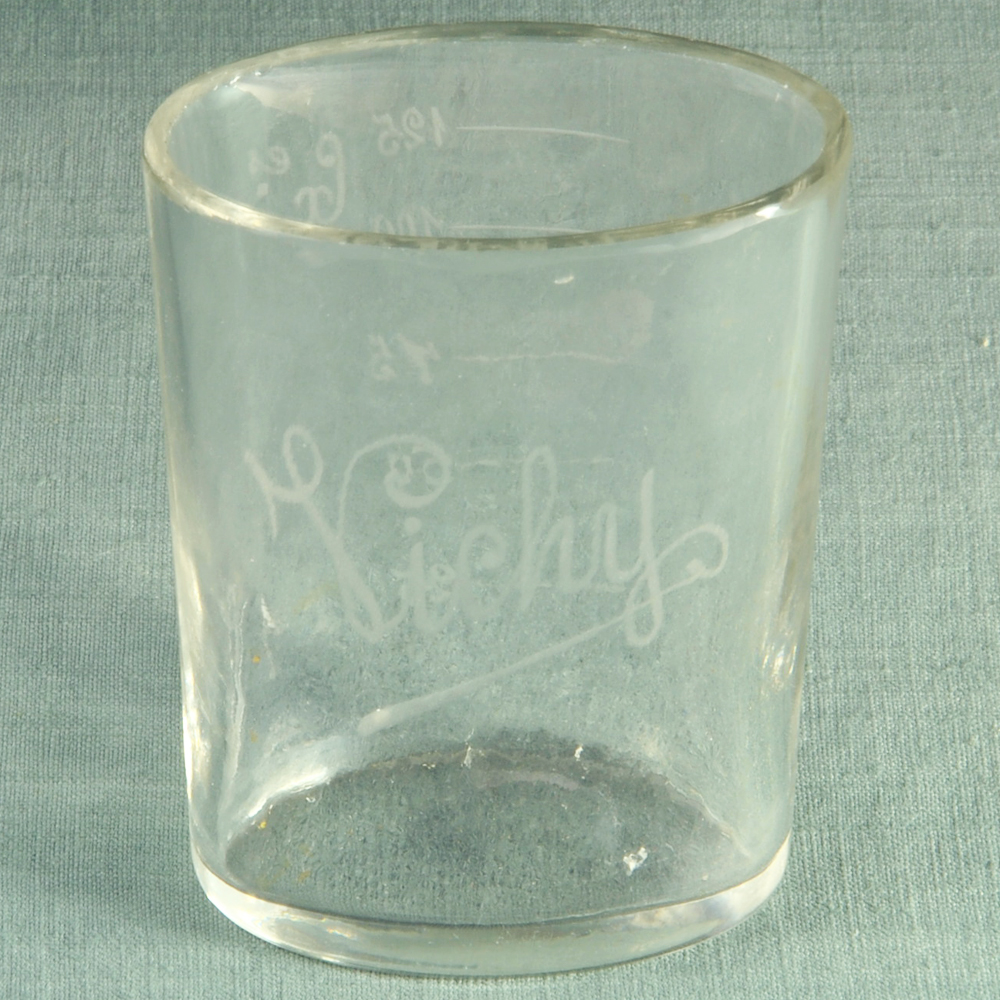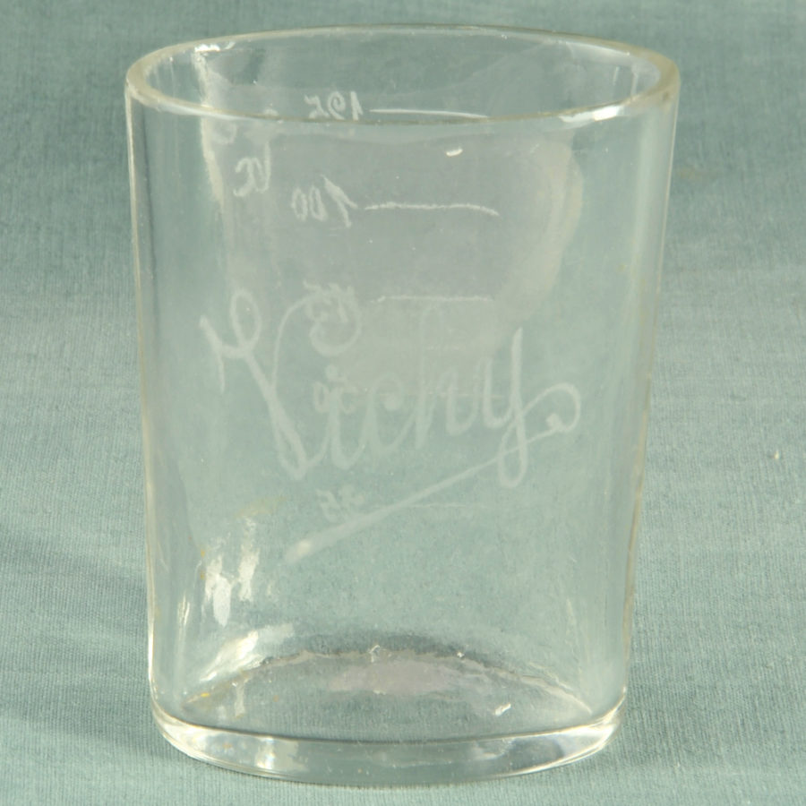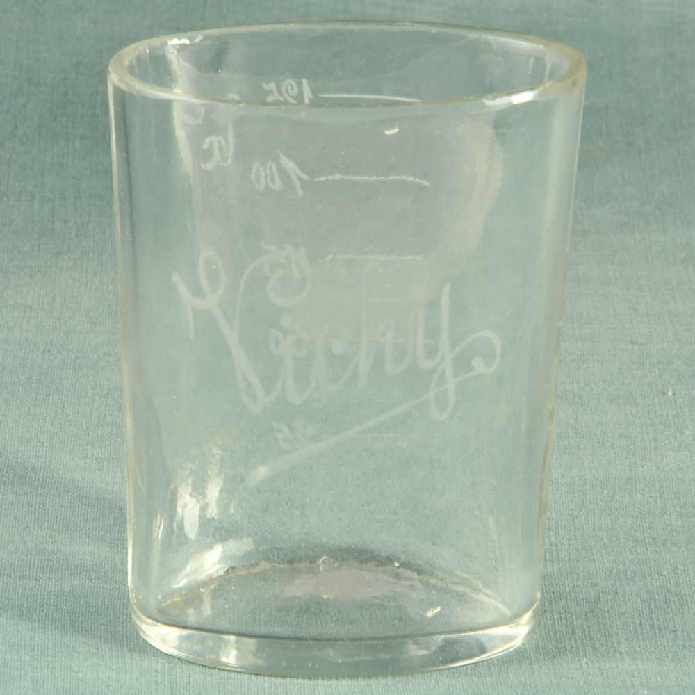 Verre de cure épais 1900 gravé « Vichy », gradué. H.: 95 mm 74 mm x 47 mm