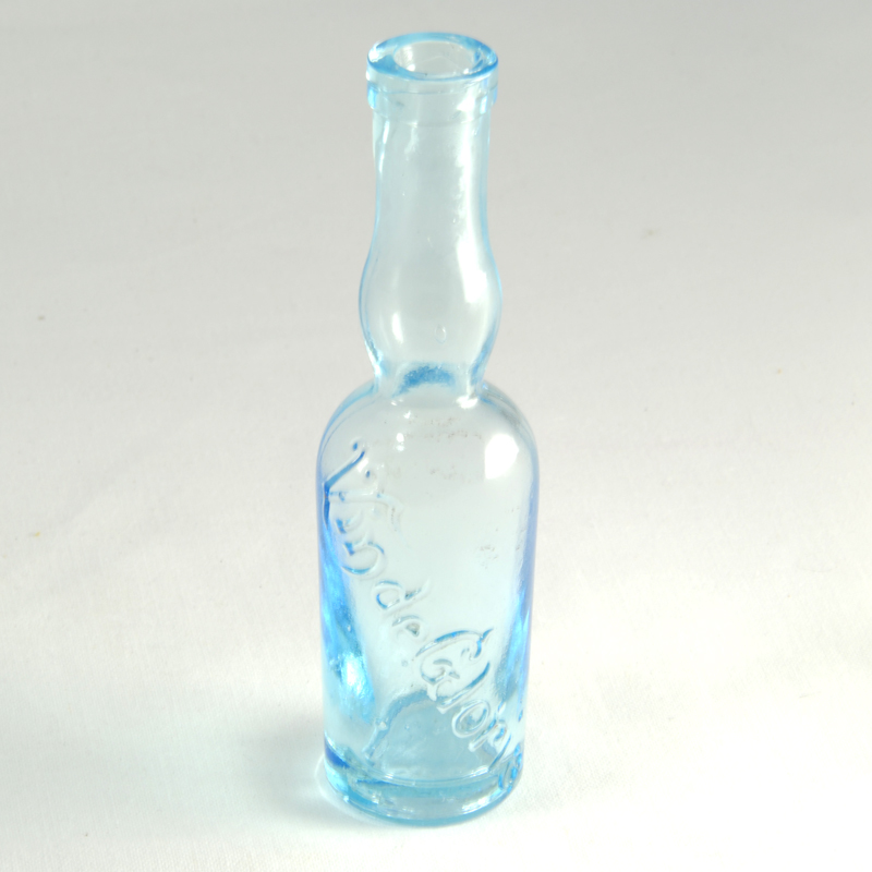 Petit flacon en verre bleu pâle « Vin de Gloria », ca 1900