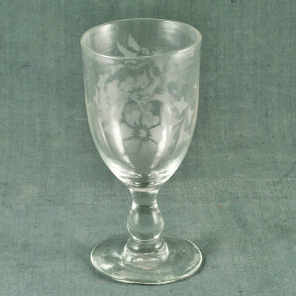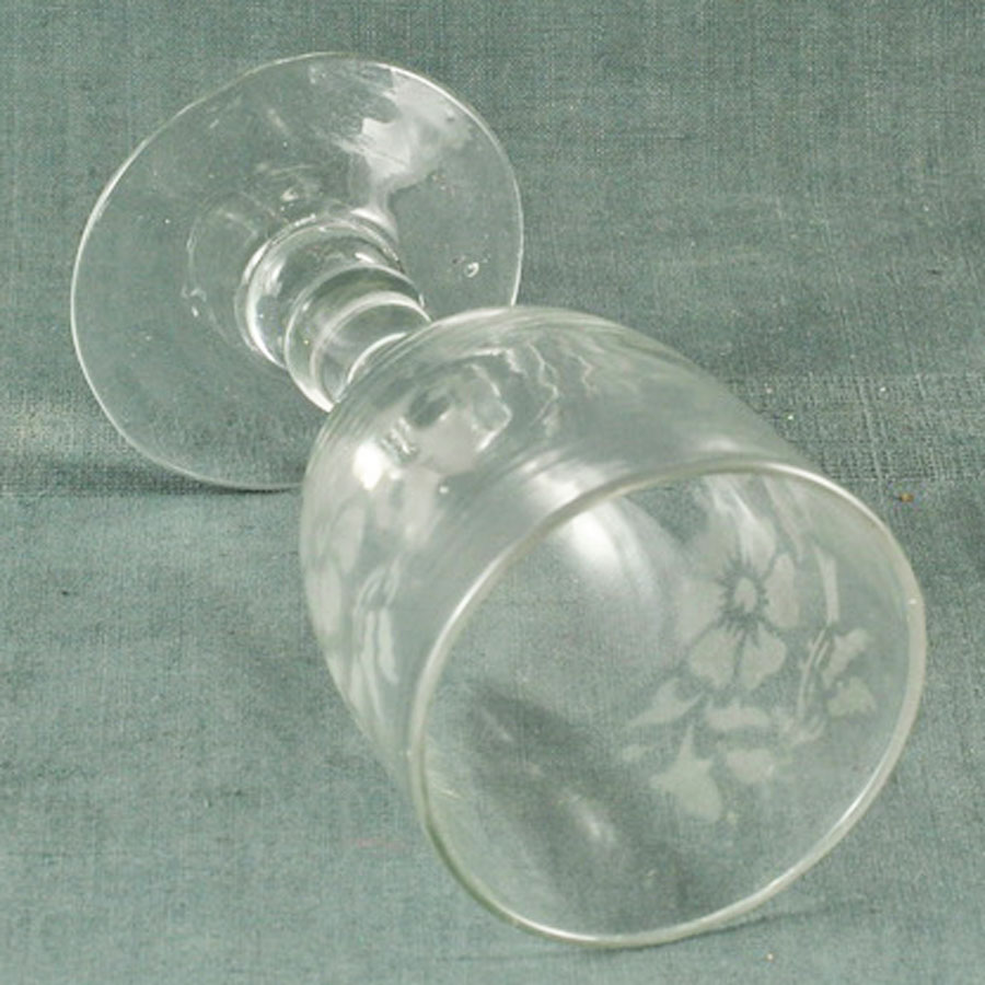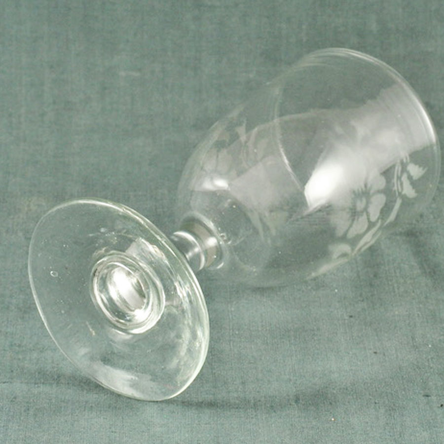 joli verre à pied XIXeà pied balustre en verre soufflé décor floral gravé TBEtat