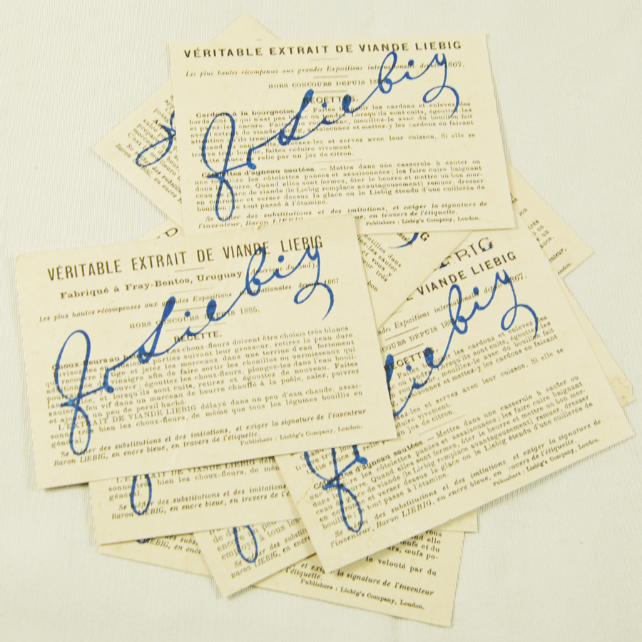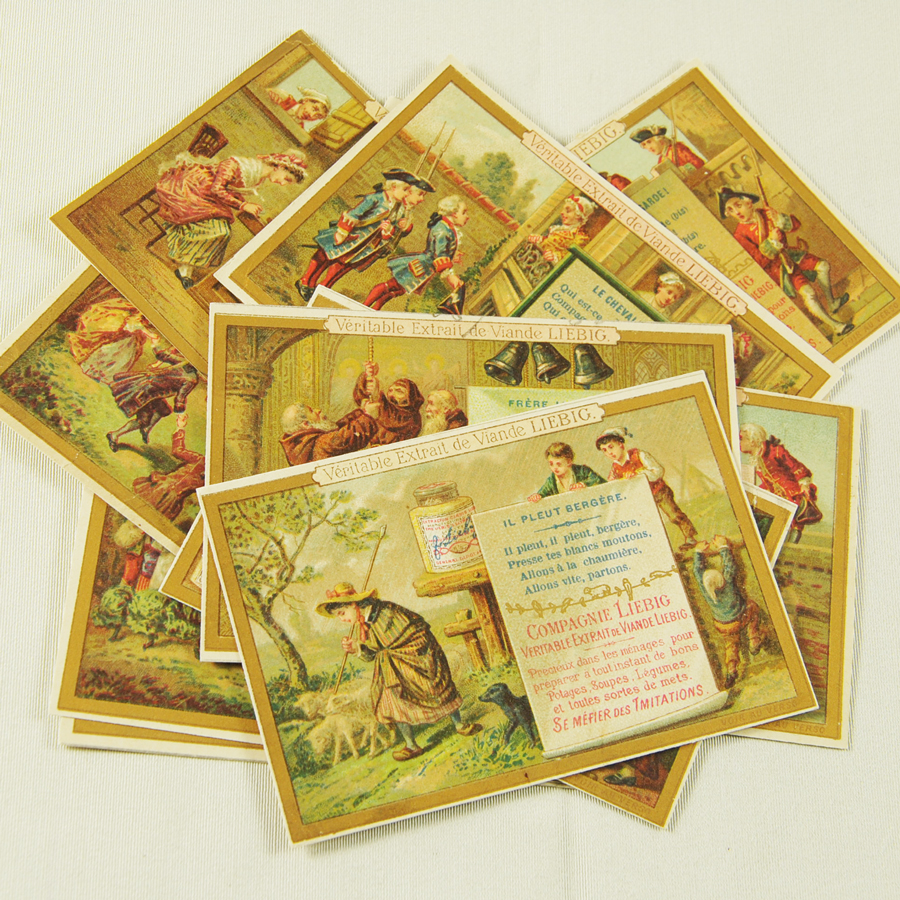 11 jolies images 1900 « Chansons Françaises Enfantines » lithographiées par la Compagnie Liebig (« véritable extrait de viande »). 102 mm x 70 mm